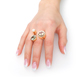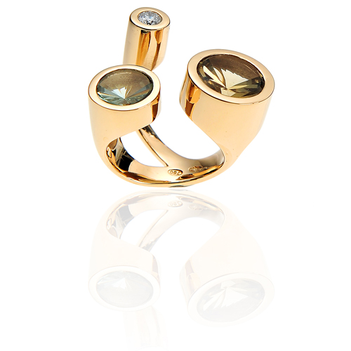 Runde Elemente schweben auf der Hand versehen mit feinen, unterschiedlich grossen, auf- einander abgestimmten Edelsteinen. Hat man ihn nach naeherer Betrachtung einmal lieb gewonnen, ist dieser Ring ein unverwechselbarer und angenehmer Begleiter fuer viele Situationen.