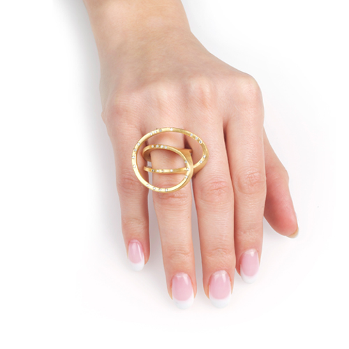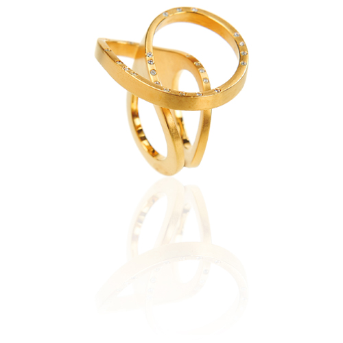 Dieser Skulpturale Ring verkoerpert die goldene Unendlichkeit, ein feiner Goldstreifen mit feinen Brillanten versehen, windet sich wie eine endlos Schleife ueber dem Finger und verleitet zum traeumen.
