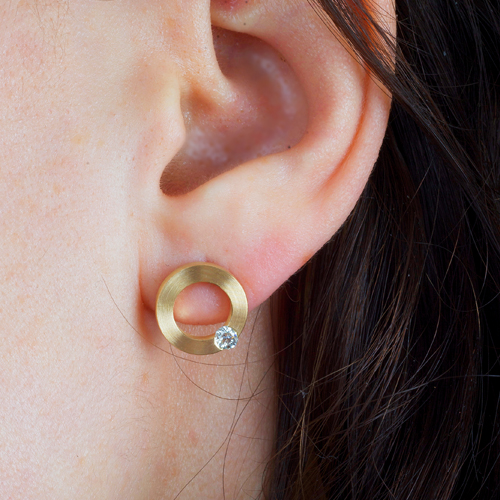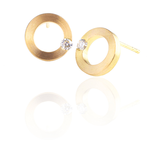 Kleine auf dem Ohr schwebende goldenen Kreise mit feinen Brillanten besetzt zieren das Ohr auf besondere Weise, klassische Ohrstecker mit Pfiff und 12mm Durchmesser.